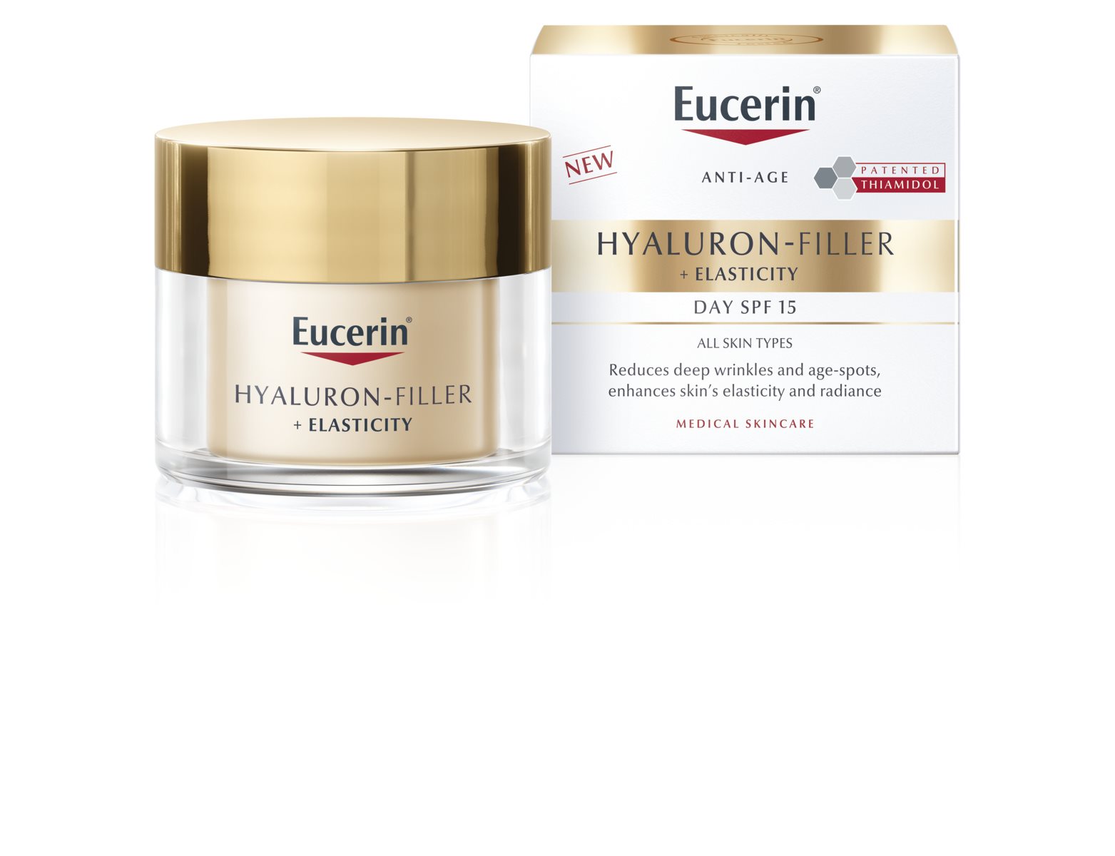 Eucerin Hyaluron-Filler + Elasticity Day SPF 15 ir dienas krēms pret novecošanos, kas piepilda dziļas grumbas, uzlabo ādas elastību un koriģē vecuma plankumus.