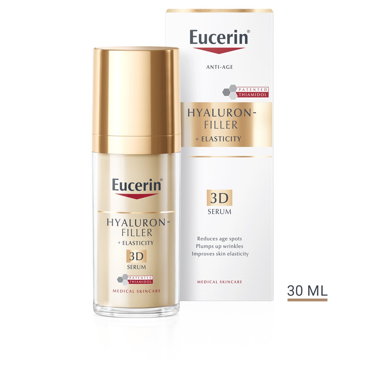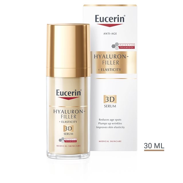 Seruma sastāvā ir augstas un zemas molekulmasas hialuronskābe, kas uzlabo ādas mitrināšanu, tomēr tā sastāvs nav veidots tā, lai tas varētu aizstāt dienas vai nakts mitrinošo krēmu vai acu krēmu. Lai iegūtu labākos rezultātus, mēs iesakām to lietot kopā ar citiem Eucerin Hyaluron-Filler + Elasticity sērijas produktiem.