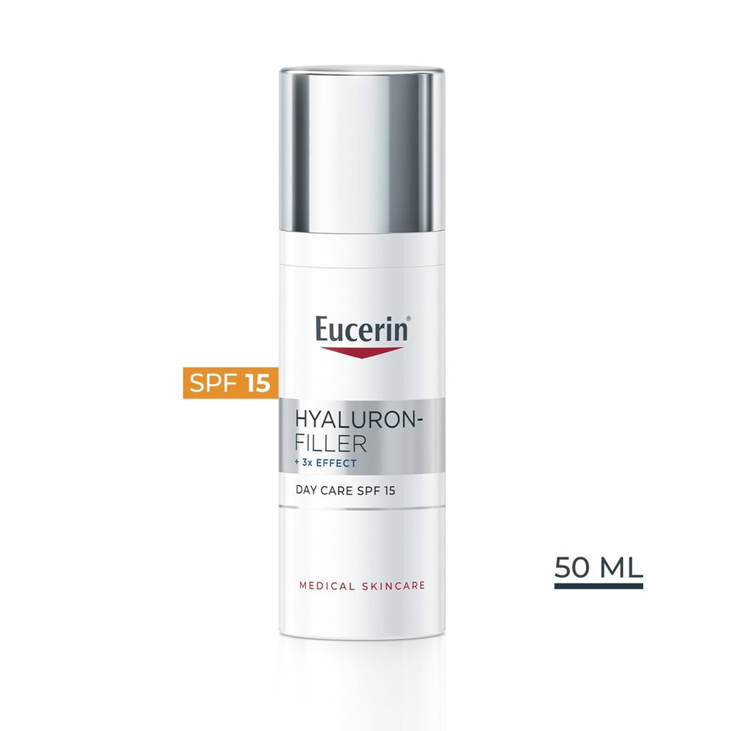 Eucerin Hyaluron-Filler +3x Effect sērija ir īpaši izstrādāta, lai novērstu pirmās novecošanas pazīmes, piemēram, smalkās līnijas un dziļākas grumbas, kas parasti sāk parādīties ap 30 gadu vecumu ģenētisku un dzīvesveida faktoru ietekmē. Eucerin Hyaluron-Filler +3x Effect dienas krēms ar SPF 15 normālai un kombinētai ādai ir sejas mitrinātājs ar SPF 15, kas apvieno augstas un zemas molekulmasas hialuronskābi, redzami piepildot grumbas, vienlaikus nodrošinot ilgstošu mitrināšanu.